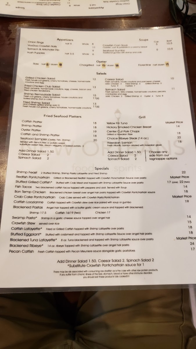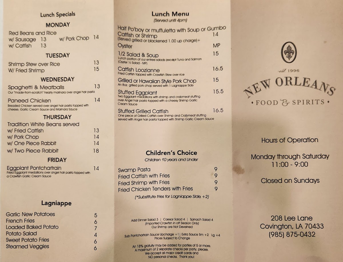 Welcome to New Orleans Food & Spirits, a vibrant eatery nestled in Covington, LA, that embodies the heart of New Orleans culinary tradition. The menu is a feast for the senses, featuring highlighted dishes like the Yellow Fin Tuna ($21) and Hickory Smoked Chicken Breast ($17), each cooked to perfection. For seafood lovers, the Shrimp Feast ($25) and Crab Cake Pontchartrain are must-tries, perfectly complemented by luscious sides like garlic potatoes.